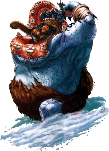 - Being featured in the "brawler"/party game styled Isuka, being fought in Antarctica, and being a massive creature, in this case a Gear, controlled by human entity, may be inspired by the shock rock act group GWAR, who are known for their stage acts of costumes and band personas, and in GWAR's lore, their home base lies in Antarctica. Along with featuring massive creature props for their tours and concerts, such as their pet World Maggot, GWAR had also made side production feature movies in the 1990s, with climatic battles with the band against gargantuan and freakish monsters and entities using the same level of large scale props. Its Gear body when the mouth and upper head is positioned upright is also evocative of Gor-Gor, GWAR's pet kaiju tyrannosaurus rex which they use to lay waste to New York City and is the namesake title subject of the song on their America Must Be Destroyed album.