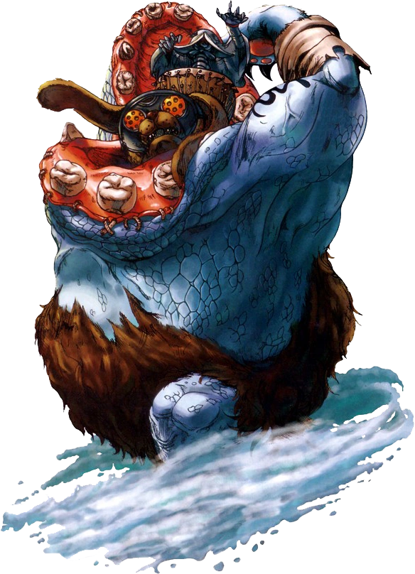 Leopaldon is extremely resilient, as the Gear's belly is impervious to all attacks; the game reads all attacks directed there as a Guard. To defeat him, one must attack the sorcerer and his dog; as they're stationed in the Gear's open mouth, they can only be defeated by aerial attacks. He can also be hurt by hitting his back by using a teleportation attack. His main technique are claw swipes, as well as forming walls of ice or fire stones via magic spells.